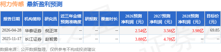 我们预计2026-2028年公司利润分别3.9/4.6/5.5亿元,同比+15.4%/+17.2%/+18.6%,当前市值对应公司26年41倍PE,公司是机器人传感器综合性龙头,主业稳健增长,维持“买入”评级。