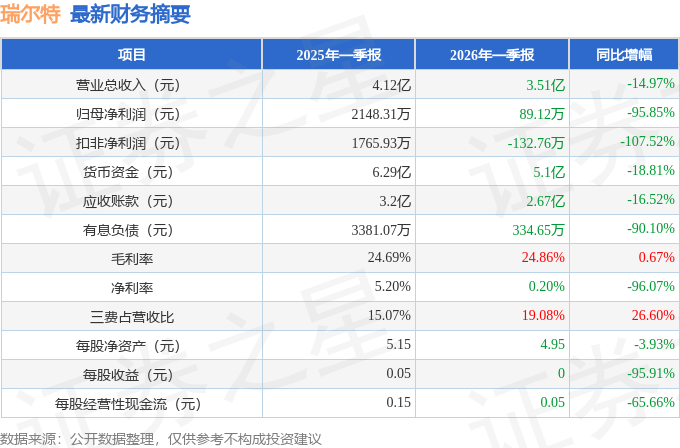 据证券之星公开数据整理,近期瑞尔特(002790)发布2026年一季报。截至本报告期末,公司营业总收入3.51亿元,同比下降14.97%,归母净利润89.12万元,同比下降95.85%。按单季度数据看,第一季度营业总收入3.51亿元,同比下降14.97%,第一季度归母净利润89.12万元,同比下降95.85%。本报告期瑞尔特公司应收账款体量较大,当期应收账款占最新年报归母净利润比达1458.15%。