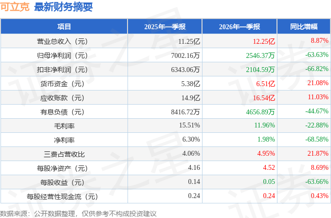 据证券之星公开数据整理,近期可立克(002782)发布2026年一季报。截至本报告期末,公司营业总收入12.25亿元,同比上升8.87%,归母净利润2546.37万元,同比下降63.63%。按单季度数据看,第一季度营业总收入12.25亿元,同比上升8.87%,第一季度归母净利润2546.37万元,同比下降63.63%。本报告期可立克公司应收账款体量较大,当期应收账款占最新年报归母净利润比达552.01%。
