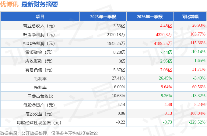 据证券之星公开数据整理,近期优博讯(300531)发布2026年一季报。截至本报告期末,公司营业总收入4.48亿元,同比上升26.93%,归母净利润4320.3万元,同比上升103.77%。按单季度数据看,第一季度营业总收入4.48亿元,同比上升26.93%,第一季度归母净利润4320.3万元,同比上升103.77%。本报告期优博讯公司应收账款体量较大,当期应收账款占最新年报归母净利润比达354.14%。