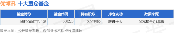 持有优博讯最多的基金为中证2000ETF广发,目前规模为0.66亿元,最新净值1.5521(4月28日),较上一交易日下跌1.04%,近一年上涨48.51%。该基金现任基金经理为夏浩洋。