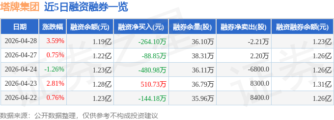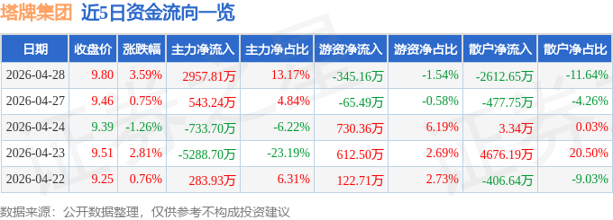 证券之星消息,截至2026年4月28日收盘,塔牌集团(002233)报收于9.8元,上涨3.59%,换手率1.98%,成交量23.29万手,成交额2.25亿元。