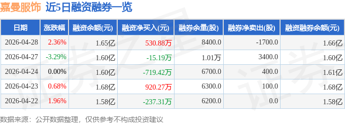 证券之星消息,截至2026年4月28日收盘,嘉曼服饰(301276)报收于26.48元,上涨2.36%,换手率6.19%,成交量4.47万手,成交额1.18亿元。