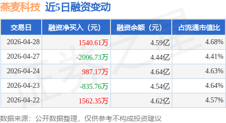证券之星消息,4月28日,燕麦科技(688312)融资买入6778.92万元,融资偿还5238.32万元,融资净买入1540.61万元,融资余额4.59亿元,近20个交易日中有14个交易日出现融资净买入。