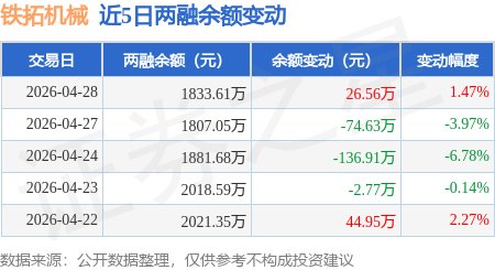 证券之星消息,4月28日,铁拓机械(920706)融资买入107.64万元,融资偿还81.08万元,融资净买入26.56万元,融资余额1833.61万元。