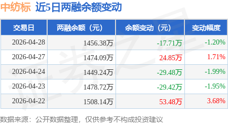 证券之星消息,4月28日,中纺标(920122)融资买入23.6万元,融资偿还41.3万元,融资净卖出17.71万元,融资余额1456.38万元,近20个交易日中有11个交易日出现融资净买入。