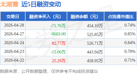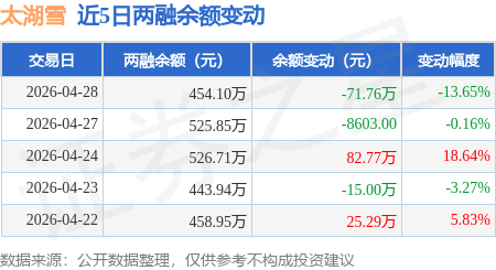 证券之星消息,4月28日,太湖雪(920262)融资买入33.46万元,融资偿还105.21万元,融资净卖出71.76万元,融资余额454.1万元。