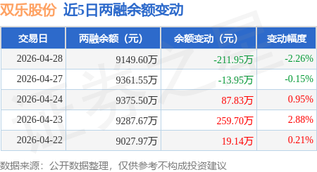 证券之星消息,4月28日,双乐股份(301036)融资买入313.66万元,融资偿还525.37万元,融资净卖出211.7万元,融资余额9126.15万元。