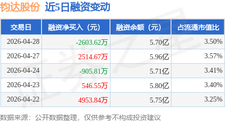证券之星消息,4月28日,钧达股份(002865)融资买入5878.41万元,融资偿还8482.02万元,融资净卖出2603.62万元,融资余额5.7亿元。
