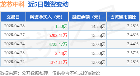 证券之星消息,4月28日,龙芯中科(688047)融资买入1.63亿元,融资偿还2.93亿元,融资净卖出1.3亿元,融资余额14.25亿元,近20个交易日中有11个交易日出现融资净买入。