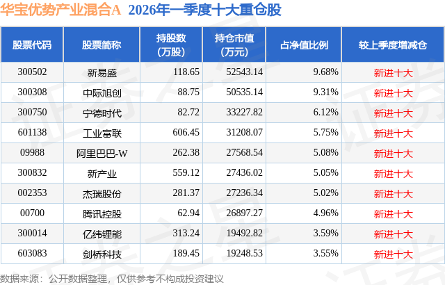 根据2026基金Q1季报公募基金重仓股数据,重仓该股的公募基金共30家,其中持有数量最多的公募基金为华宝基金的华宝优势产业混合A。华宝优势产业混合A目前规模为46.19亿元,最新净值1.0821(4月28日),较上一交易日下跌0.47%。该公募基金现任基金经理为郑英亮。郑英亮在任的基金产品包括:华宝核心优势混合A,管理时间为2021年12月31日至今,期间收益率为142.58%;华宝大盘精选混合,管理时间为2023年2月21日至今,期间收益率为148.16%;