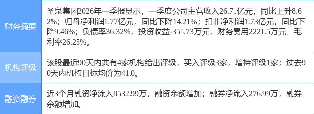 2026年4月28日,开源证券研究员金益腾,徐正凤发布了对圣泉集团的研报《公司信息更新报告:业绩符合预期,先进电子材料及电池材料快速放量》,该研报对圣泉集团给出“买入”评级。研报中预计公司2026-2028年归母净利润分别为13.86、16.59、19.47亿元,EPS分别为1.64、1.96、2.30元/股,当前股价对应PE为24.2、20.3、17.3倍。我们看好公司依靠产业链优势协同进行技术研发和市场拓展,“化工新材料+生物质材料”双主业运营稳健,未来成长动力充足,维持“买入”评级。证券之星数据中心根据近三年发布的研报数据计算,该研报作者对此股的盈利预测准确度为77.9%。