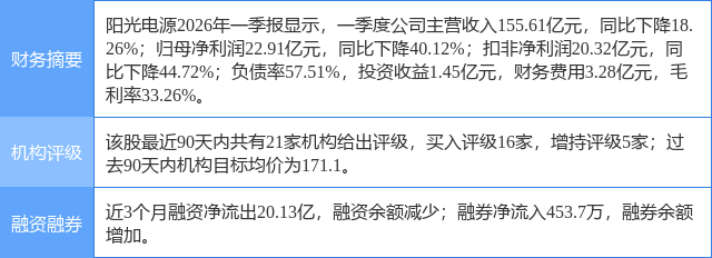 2026年4月28日,东吴证券研究员曾朵红,郭亚男,余慧勇,胡隽颖发布了对阳光电源的研报《26一季报点评:高基数+汇兑致Q1同比下滑,储能持续高增,AI储能及AIDC潜力可期》,该研报对阳光电源给出“买入”评级。研报中预计公司26-28年归母净利润为140/170/221亿元(前值为150/182/228亿元),同比+4%/+21%/+30%,对应PE为19/16/12倍,由于储能行业高增,AI储能和AIDC业务贡献弹性,维持“买入”评级。证券之星数据中心根据近三年发布的研报数据计算,该研报作者对此股的盈利预测准确度为95.51%。