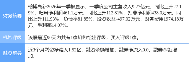 2026年3月3日,西南证券研究员钱伟伦发布了对翰博高新的研报《拟收购韩国东进中国资产,有望成为湿电子化学品黑马》,该研报对翰博高新给出“买入”评级。研报中预计2025-2027年EPS分别为-0.44元、0.81元、1.16元(此前分别为0.05、0.84、1.17元),维持“买入”评级。证券之星数据中心根据近三年发布的研报数据计算,该研报作者对此股的盈利预测准确度为67.77%。