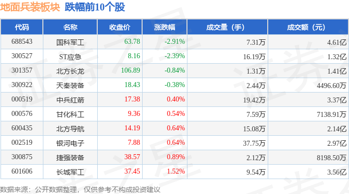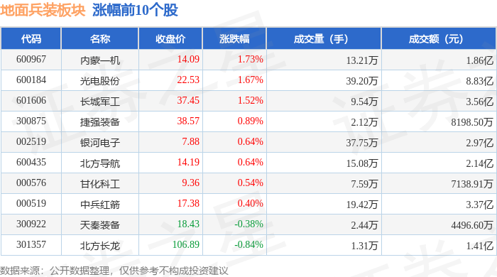 证券之星消息,4月29日地面兵装板块较上一交易日上涨0.55%,内蒙一机领涨。当日上证指数报收于4107.51,上涨0.71%。深证成指报收于15120.92,上涨1.96%。地面兵装板块个股涨跌见下表: