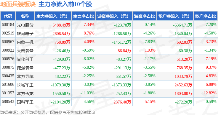 从资金流向上来看,当日地面兵装板块主力资金净流出3900.23万元,游资资金净流出1742.07万元,散户资金净流入5642.31万元。地面兵装板块个股资金流向见下表: