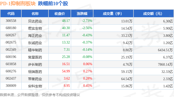 证券之星消息,4月29日PD-1抑制剂板块较上一交易日上涨0.42%,科伦药业领涨。当日上证指数报收于4107.51,上涨0.71%。深证成指报收于15120.92,上涨1.96%。PD-1抑制剂板块个股涨跌见下表: