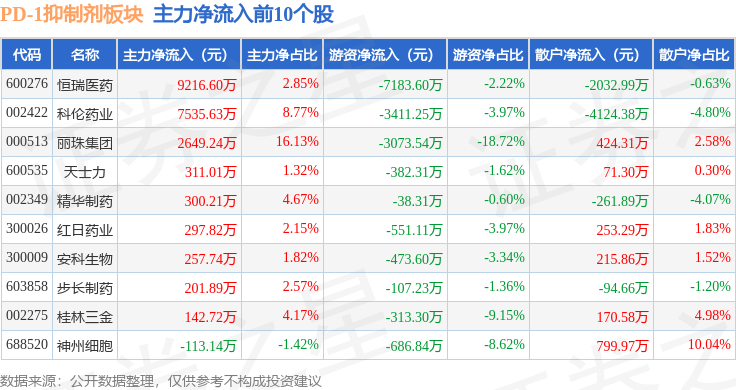 从资金流向上来看,当日PD-1抑制剂板块主力资金净流出6.59亿元,游资资金净流入7332.82万元,散户资金净流入5.85亿元。PD-1抑制剂板块个股资金流向见下表: