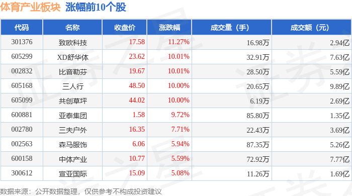 证券之星消息,4月29日体育产业板块较上一交易日上涨1.38%,致欧科技领涨。当日上证指数报收于4107.51,上涨0.71%。深证成指报收于15120.92,上涨1.96%。体育产业板块个股涨跌见下表: