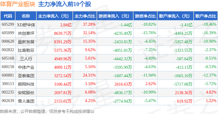 从资金流向上来看,当日体育产业板块主力资金净流入4.53亿元,游资资金净流出4.56亿元,散户资金净流入250.56万元。体育产业板块个股资金流向见下表: