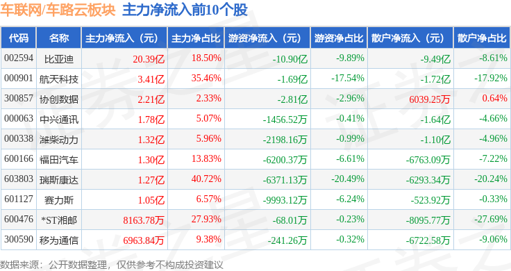 从资金流向上来看,当日车联网/车路云板块主力资金净流出3.02亿元,游资资金净流出8.26亿元,散户资金净流入11.28亿元。车联网/车路云板块个股资金流向见下表: