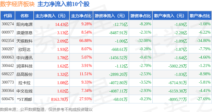 从资金流向上来看,当日数字经济板块主力资金净流入2.1亿元,游资资金净流出20.57亿元,散户资金净流入18.47亿元。数字经济板块个股资金流向见下表: