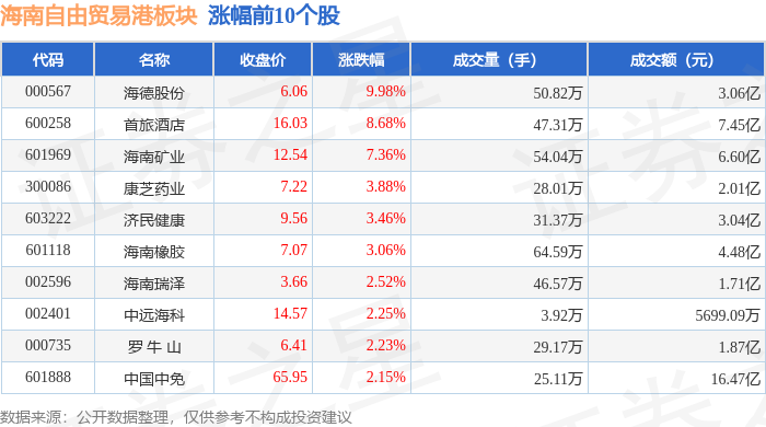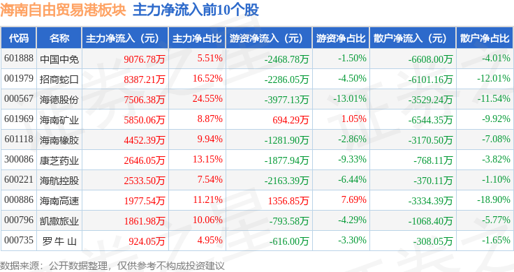 从资金流向上来看,当日海南自由贸易港板块主力资金净流入2.99亿元,游资资金净流出3.12亿元,散户资金净流入1309.78万元。海南自由贸易港板块个股资金流向见下表:
