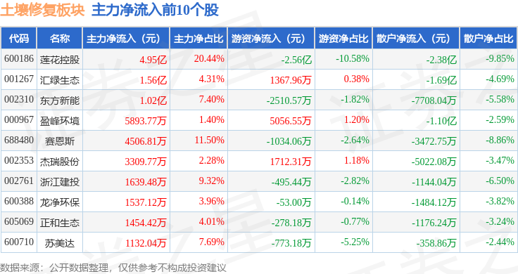 从资金流向上来看,当日土壤修复板块主力资金净流入7.97亿元,游资资金净流出3.59亿元,散户资金净流出4.38亿元。土壤修复板块个股资金流向见下表: