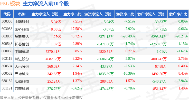 从资金流向上来看,当日F5G板块主力资金净流入19.57亿元,游资资金净流出21.38亿元,散户资金净流入1.81亿元。F5G板块个股资金流向见下表: