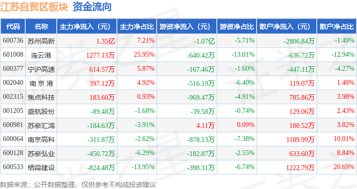 从资金流向上来看,当日江苏自贸区板块主力资金净流入1.42亿元,游资资金净流出1.45亿元,散户资金净流入370.23万元。江苏自贸区板块个股资金流向见下表: