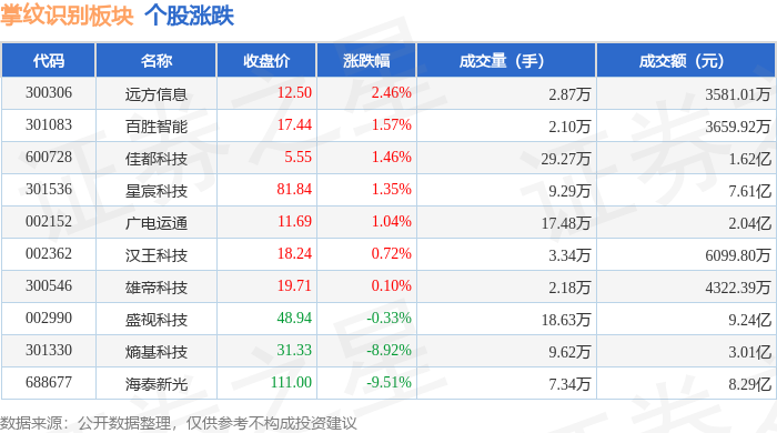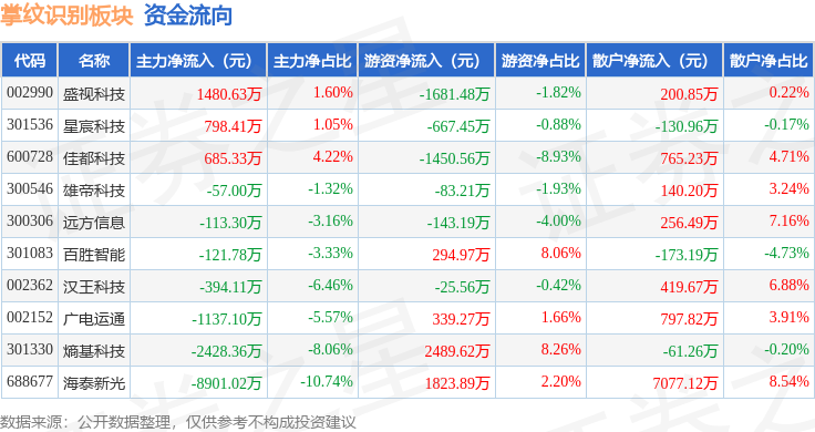从资金流向上来看,当日掌纹识别板块主力资金净流出1.02亿元,游资资金净流入896.3万元,散户资金净流入9291.99万元。掌纹识别板块个股资金流向见下表: