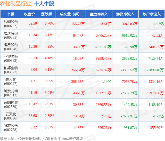 个股表现方面,农化制品行业当日领涨股为盐湖股份(000792),该股当日报收39.5,上涨6.7%,成交量155.77万,主力资金净流入3.61亿元。宏达股份(600331)以上涨6.13%紧随其后,该股当日成交量84.47万,主力资金净流入6775.7万元。除此之外,澄星股份(600078)、亚钾国际(000893)、和邦生物(603077)均进入当日牛股之列。具体个股列表见下表: