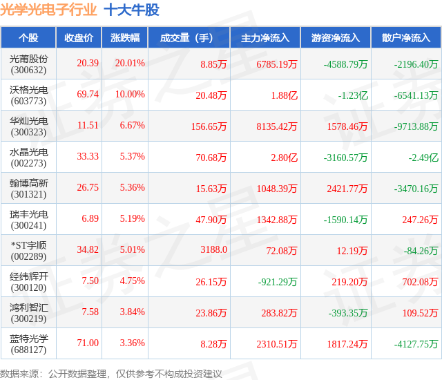个股表现方面,光学光电子行业当日领涨股为光莆股份(300632),该股当日报收20.39,上涨20.01%,成交量8.85万,主力资金净流入6785.19万元。沃格光电(603773)以上涨10.0%紧随其后,该股当日成交量20.48万,主力资金净流入1.88亿元。除此之外,华灿光电(300323)、水晶光电(002273)、翰博高新(301321)均进入当日牛股之列。具体个股列表见下表: