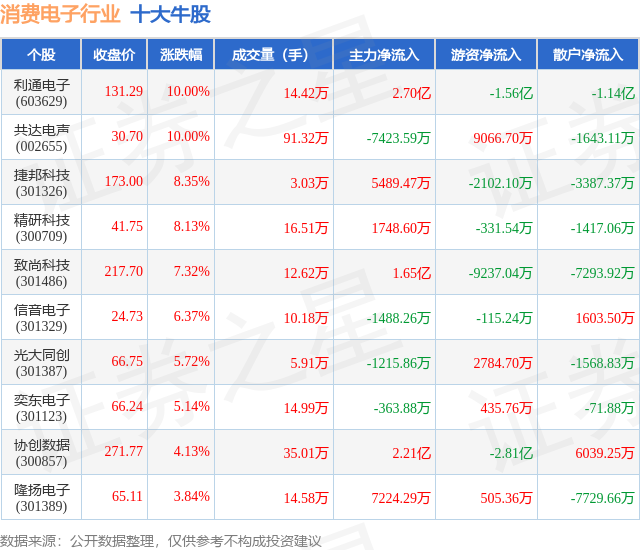个股表现方面,消费电子行业当日领涨股为利通电子(603629),该股当日报收131.29,上涨10.0%,成交量14.42万,主力资金净流入2.7亿元。共达电声(002655)以上涨10.0%紧随其后,该股当日成交量91.32万,主力资金净流出7423.59万元。除此之外,捷邦科技(301326)、精研科技(300709)、致尚科技(301486)均进入当日牛股之列。具体个股列表见下表: