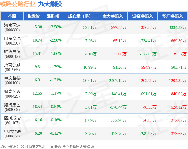 个股表现方面,铁路公路行业当日领跌股为海南高速(000886),该股当日报收5.38,下跌3.58%,成交量32.81万,主力资金净流入1977.54万元。山东高速(600350)以下跌2.98%紧随其后,该股当日成交量7.26万,主力资金净流入65.12万元。除此之外,皖通高速(600012)、招商公路(001965)、重庆路桥(600106)均进入当日熊股之列。具体个股列表见下表: