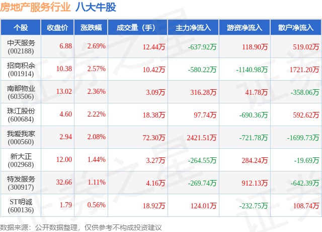 个股表现方面,房地产服务行业当日领涨股为中天服务(002188),该股当日报收6.88,上涨2.69%,成交量12.44万,主力资金净流出637.92万元。招商积余(001914)以上涨2.57%紧随其后,该股当日成交量10.42万,主力资金净流出580.22万元。除此之外,南都物业(603506)、珠江股份(600684)、我爱我家(000560)均进入当日牛股之列。具体个股列表见下表:
