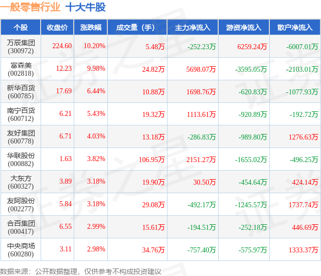 个股表现方面,一般零售行业当日领涨股为万辰集团(300972),该股当日报收224.6,上涨10.2%,成交量5.48万,主力资金净流出252.23万元。富森美(002818)以上涨9.98%紧随其后,该股当日成交量24.82万,主力资金净流入5698.07万元。除此之外,新华百货(600785)、南宁百货(600712)、友好集团(600778)均进入当日牛股之列。具体个股列表见下表: