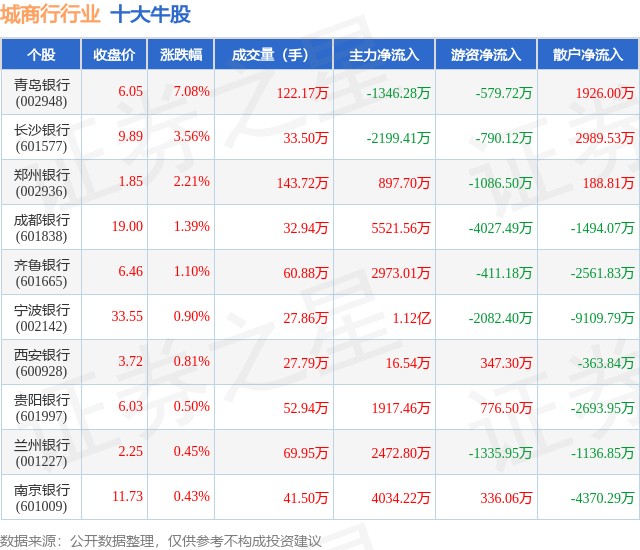 个股表现方面,城商行行业当日领涨股为青岛银行(002948),该股当日报收6.05,上涨7.08%,成交量122.17万,主力资金净流出1346.28万元。长沙银行(601577)以上涨3.56%紧随其后,该股当日成交量33.5万,主力资金净流出2199.41万元。除此之外,郑州银行(002936)、成都银行(601838)、齐鲁银行(601665)均进入当日牛股之列。具体个股列表见下表: