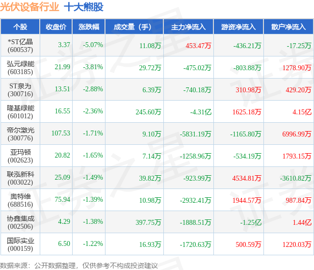个股表现方面,光伏设备行业当日领跌股为*ST亿晶(600537),该股当日报收3.37,下跌5.07%,成交量11.08万,主力资金净流入453.47万元。弘元绿能(603185)以下跌3.81%紧随其后,该股当日成交量29.72万,主力资金净流出475.02万元。除此之外,ST泉为(300716)、隆基绿能(601012)、帝尔激光(300776)均进入当日熊股之列。具体个股列表见下表: