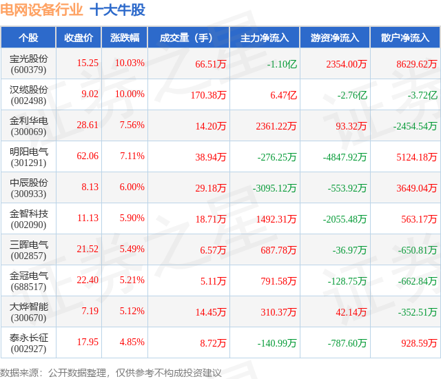 个股表现方面,电网设备行业当日领涨股为宝光股份(600379),该股当日报收15.25,上涨10.03%,成交量66.51万,主力资金净流出1.1亿元。汉缆股份(002498)以上涨10.0%紧随其后,该股当日成交量170.38万,主力资金净流入6.47亿元。除此之外,金利华电(300069)、明阳电气(301291)、中辰股份(300933)均进入当日牛股之列。具体个股列表见下表:
