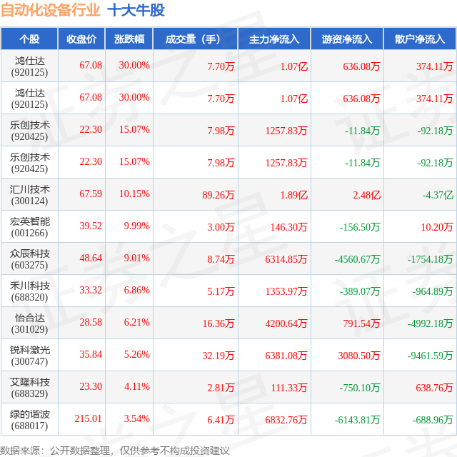 个股表现方面,自动化设备行业当日领涨股为鸿仕达(920125),该股当日报收67.08,上涨30.0%,成交量7.7万,主力资金净流入1.07亿元。鸿仕达(920125)以上涨30.0%紧随其后,该股当日成交量7.7万,主力资金净流入1.07亿元。除此之外,乐创技术(920425)、乐创技术(920425)、汇川技术(300124)均进入当日牛股之列。具体个股列表见下表: