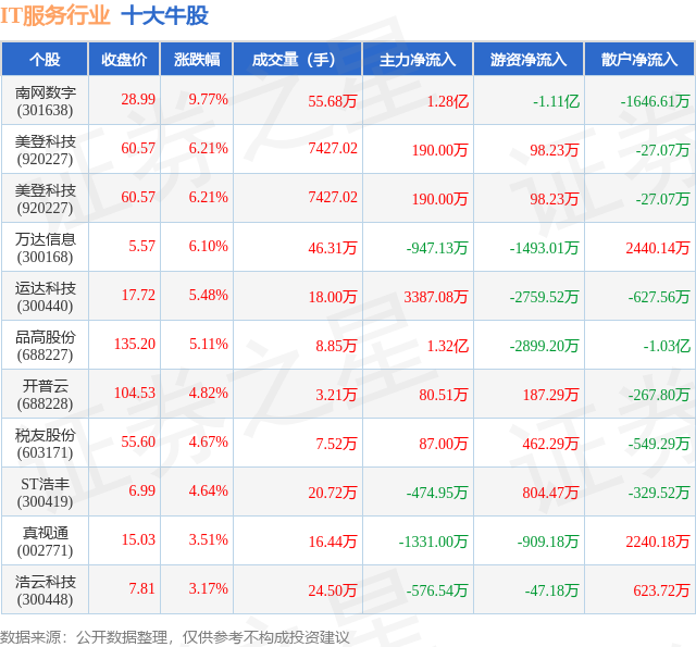 个股表现方面,IT服务行业当日领涨股为南网数字(301638),该股当日报收28.99,上涨9.77%,成交量55.68万,主力资金净流入1.28亿元。美登科技(920227)以上涨6.21%紧随其后,该股当日成交量7427.0,主力资金净流入190.0万元。除此之外,美登科技(920227)、万达信息(300168)、运达科技(300440)均进入当日牛股之列。具体个股列表见下表: