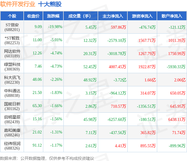个股表现方面,软件开发行业当日领跌股为ST信安(688201),该股当日报收9.09,下跌19.98%,成交量5.45万,主力资金净流入597.86万元。*ST智胜(002253)以下跌5.01%紧随其后,该股当日成交量12.32万,主力资金净流出2579.1万元。除此之外,网达软件(603189)、绿盟科技(300369)、科大讯飞(002230)均进入当日熊股之列。具体个股列表见下表: