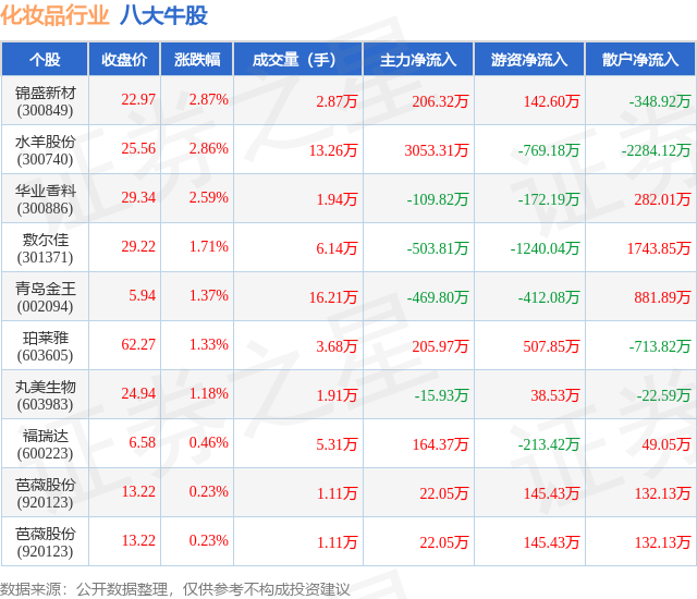 个股表现方面,化妆品行业当日领涨股为锦盛新材(300849),该股当日报收22.97,上涨2.87%,成交量2.87万,主力资金净流入206.32万元。水羊股份(300740)以上涨2.86%紧随其后,该股当日成交量13.26万,主力资金净流入3053.31万元。除此之外,华业香料(300886)、敷尔佳(301371)、青岛金王(002094)均进入当日牛股之列。具体个股列表见下表: