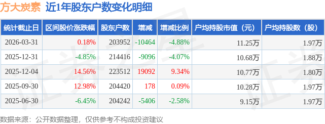 从股价来看,2025年12月31日至2026年3月31日,方大炭素区间涨幅为0.18%,在此期间股东户数减少1.05万户,减幅为4.88%。