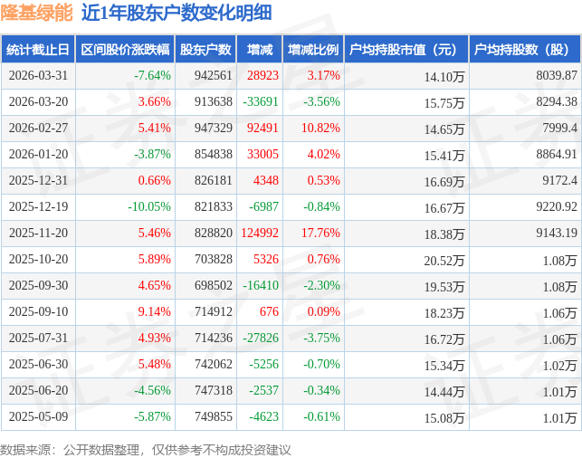 从股价来看,2026年3月20日至2026年3月31日,隆基绿能区间跌幅为7.64%,在此期间股东户数增加2.89万户,增幅为3.17%。