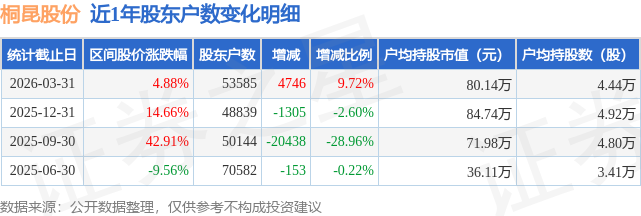 证券之星消息,近日桐昆股份披露,截至2026年3月31日公司股东户数为5.36万户,较12月31日增加4746.0户,增幅为9.72%。户均持股数量由上期的4.92万股减少至4.44万股,户均持股市值为80.14万元。