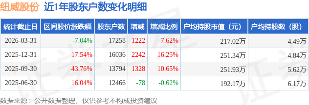 从股价来看,2025年12月31日至2026年3月31日,纽威股份区间跌幅为7.04%,在此期间股东户数增加1222.0户,增幅为7.62%。