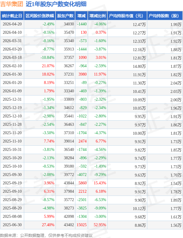 从股价来看,2026年4月10日至2026年4月20日,吉华集团区间跌幅为2.49%,在此期间股东户数减少1440.0户,减幅为4.06%。