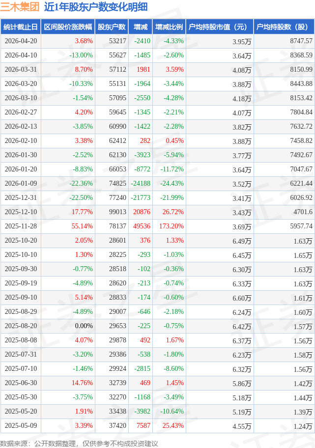 从股价来看,2026年4月10日至2026年4月20日,三木集团区间涨幅为3.68%,在此期间股东户数减少2410.0户,减幅为4.33%。